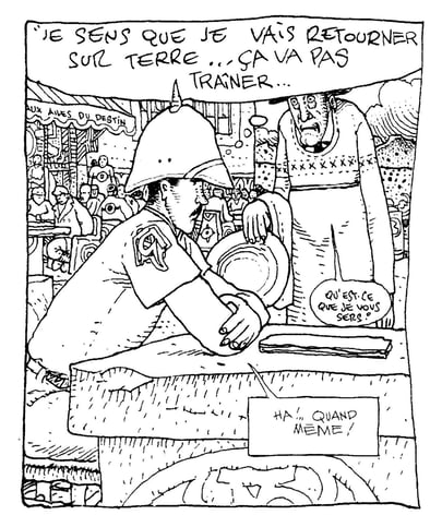 The effect is lively, but I’ll admit that when I began reading I was a little disconcerted. (Not more disconcerted, perhaps, than when I saw the original Garage for the first time, forty years ago.) Whimsical details abound. The costumes of characters mutate from panel to panel, and the Major even gets a devilish pair of horns for his helmet in one panel on the fourteenth page. Is it really possible that, as I settled into the story, succumbing (with no great effort) to its enchantment, I yet entertained a tiny, unarticulated wish that Giraud might stop his fooling and play it straight?