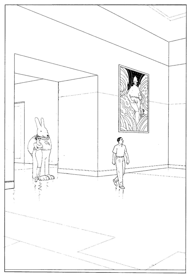 My embarrassment has been closely allied to admiration—which followed closely on the immediacy of pleasure I felt, looking at images so poised, light, spacious, and sure of themselves. Giraud’s mastery of drawing is as evident in sketches and cartoons as in some of his more fully realized work; and some small pictorial shortcuts and a characteristic inconstancy are not so much flaws as they are the hallmarks of a very personal elasticity of style.
