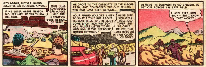 If it were simply a matter of talent and/or ability, I’d be obliged to admit that Wolverton’s achievement dwindles into insignificance when placed against Giraud’s. But the world I live in is messier than that. Even if Giraud, like Wolverton, secured a place in my attention by the initial impact of a handful of images, and even if his work, years later, repays my attention richly, as Wolverton’s has done, nothing by Giraud has ever had, for me, the concentrated seismic impact of my reading of Wolverton’s “the Devil Birds”. And no, I wasn’t eleven or twelve when I read that.