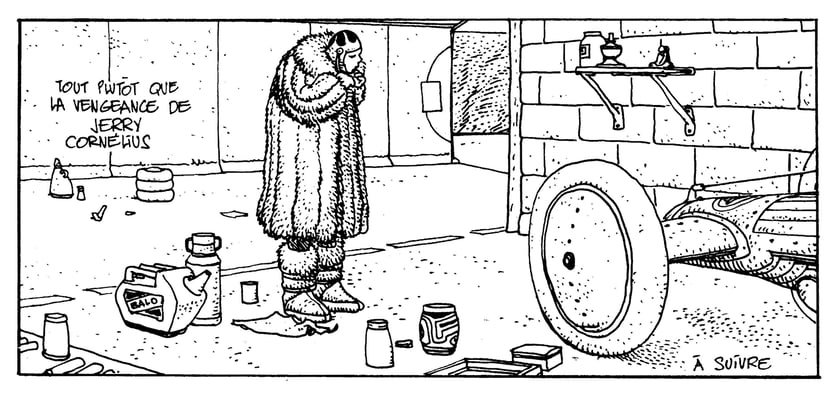 Is the hermetic garage simply what it appears to have been in episode 1—the location of the action? In 3, Barnier prepares to emerge from a garage that’s probably where he ruined the cableur. The lettering above the door plainly reads “Cornelius”, as in “The Hermetic Garage of Jerry Cornelius”. In 1992, Giraud drew the opening splash page for a four-part comic book reprint of the story. In that, the building from which Barnier will emerge can be seen being approached by guards before the action of the story begins.