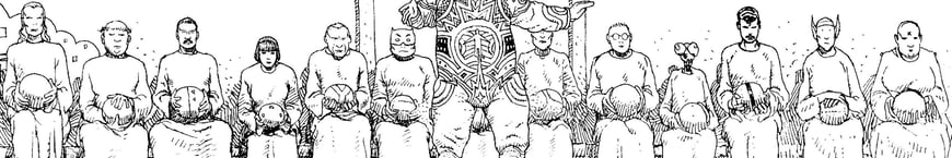 It may be observed that when McGoohan, as No.6, is allowed to meet No.1, the latter mysterious figure is seated, dressed in white robes and holding a crystal ball. The jury assembled by Sper Gossi in the Garage is likewise seated and robed; furthermore, each is holding a ball—albeit they look more like variously decorated bowling balls.