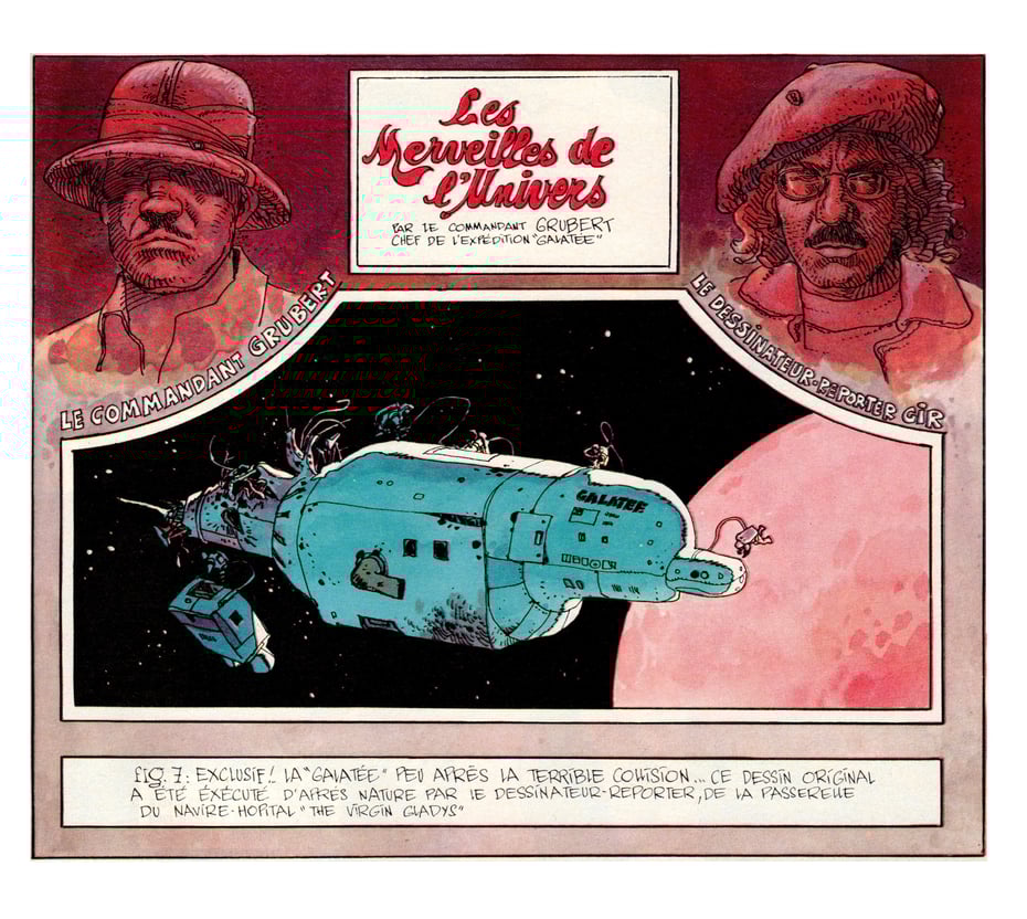 On page 13 of Metal Hurlant #41, dated June 1979, the final eight-page episode of Le Garage Hermétique de Jerry Cornelius came to an end. On page 56, the cover of the album MAJOR FATAL was printed as a full page, in black and white. On the inside back cover, its contents were advertised, and readers told that it contained one entirely unpublished page. In addition, prospective buyers were advised that if the album was purchased at one of around a hundred and fifty bookstores on an appended list, they would find in the album a limited edition color poster, featuring Grubert’s first appearance. This was a reprint of “Les Merveilles de l’Univers”, from Pilote #749 (March 14, 1974), where Commandant W. W. Grubert, leader of the Galatée expedition, was accompanied by the artist-reporter Gir. (Both are rather rough-looking characters.)