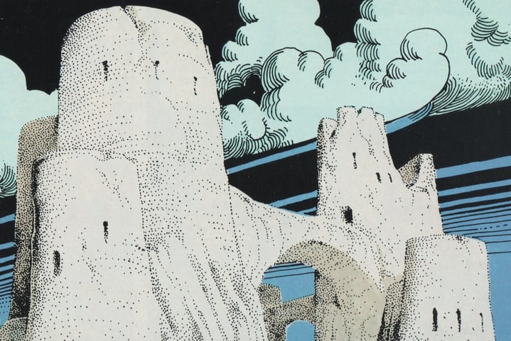 As Giraud reads that line, he experiences a moment of pleasure. The momentary and fantastic uncertainty concerning the scale of the castle reminds him of the first science-fiction story he contributed to Pilote, back in 1971. “The Artefact” also featured a castle rising from the sand, and, briefly, Giraud is almost pleased to imagine Moorcock read his story, and is making a reference to it. He dismisses the thought almost at once, but it seems, nevertheless, that his little story is validated by Moorcock’s variation on it. Giraud has done science-fiction illustrations for Galaxie, and for Opta’s limited edition hardcovers, but he’s written little. Nevertheless, however modest his efforts, here is confirmation that he exists in the same space as the writers he’s been reading since his father introduced him to science-fiction in the fifties.