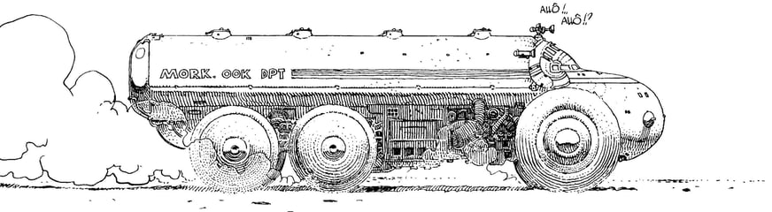 ... but, responding to Jean-Pierre Dionnet’s request for a continuation of “Le Garage Hermétique de Jerry Cornelius”, Giraud took hold of the whim, immediately and recklessly hauling Jerry Cornelius and his late father onto the first page of episode 2—albeit without picturing either of them.