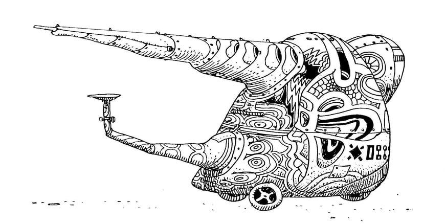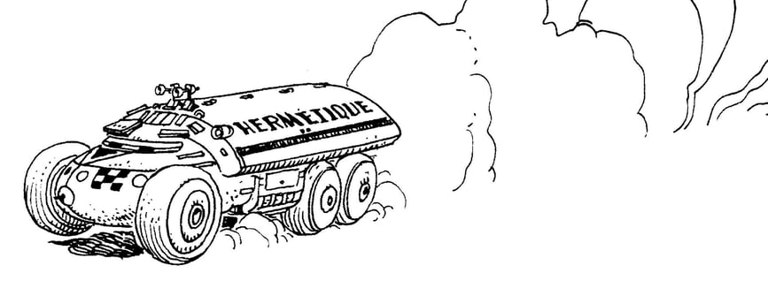 The enormous truck Cornelius drives on his return to Armjourth. Seen also in episode 5, it is described in 7 as his mobile H.Q.—TOTALLY INDETECTABLE (SAYS THE LEGEND). In 24 we learn that it travels at a speed of over 500 mites (“MiLOUS”) per hour. Despite its legendary indetectability, it is spotted by a spybird in 25. In 28, we finally see Cornelius in the cockpit; the outskirts of Armjourth are just coming into view. Cornelius finally gets out of the vehicle in 30.