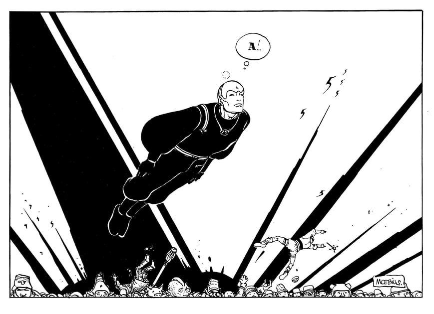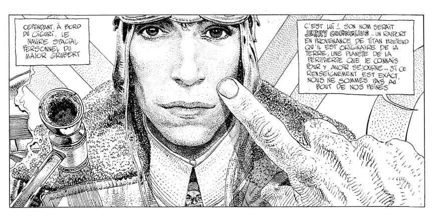 At the same time, it’s no substitute for reading the Garage if you should wish to; and the critical value of this alphabeticized abstract is quite limited. Even as a reference, it’s by no means comprehensive. Michael Moorcock and Patti Smith get a mention, if not an entry. Princess Leia doesn’t even get a mention. Nor Captain America, nor Charlie Chaplin, nor Mickey Mouse, etcetera. And there’s no point looking here for an explanation of details like the word “Alexis” that appears on Grubert’s shoulder in episode 19, which was the name of an illustrator of bandes-dessinées who had recently died just short of his thirty-first birthday. Nor does it catalogue the occasions on which Giraud playfully used photographic references in constructing his images.