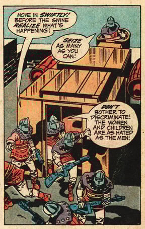 When Justifiers swoop down on the unsuspecting city, Kirby’s satire merges with allusion to a history not too remote (and broadly sustained, back in 1971, in popular culture) by offering a lightly disguised precis of Nazi terror: their victims are referred to as “SWlNE”, “NOTHlNG BUT ANlMALS” and “HUMAN TRASH” as Justifiers break down doors and drag them away. All are treated roughly: “THE WOMEN AND CHlLDREN ARE AS HATED AS THE MEN!”
