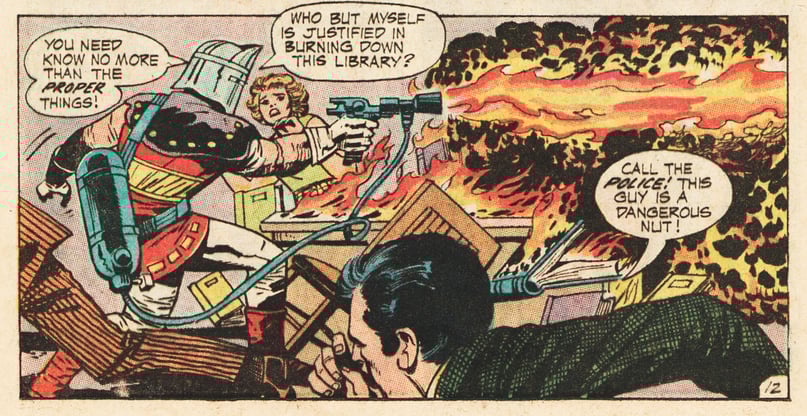Another Justifier enters a library to burn “DECADENT ” books: “THE NONSENSE STORED lN THlS PLACE SHALL NEVER POLLUTE ANOTHER MlND! YOU NEED KNOW NO MORE THAN THE PROPER THlNGS!” If the rhetoric doesn’t sound familiar, you haven’t been following the news in the year of Our Lord 2023.